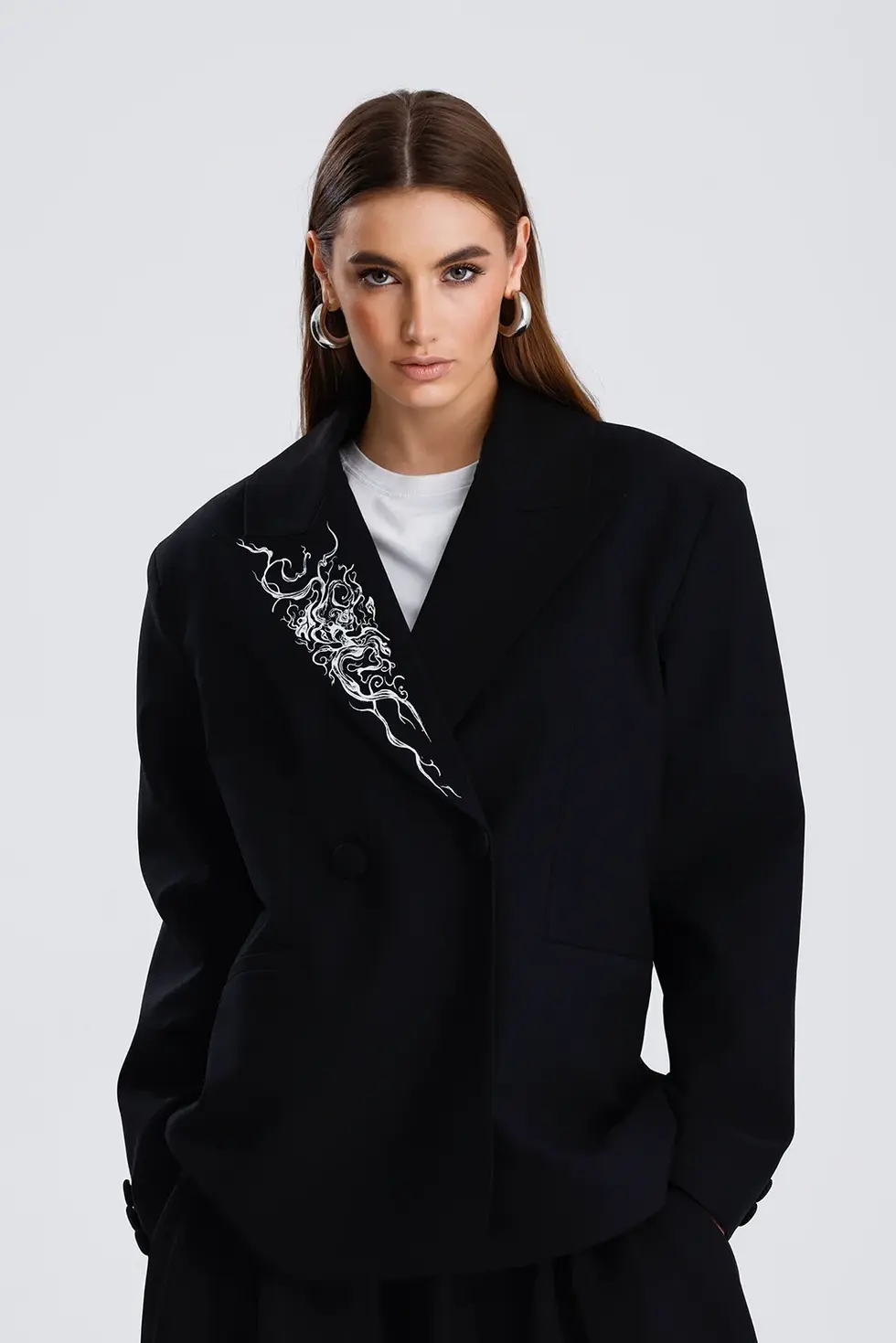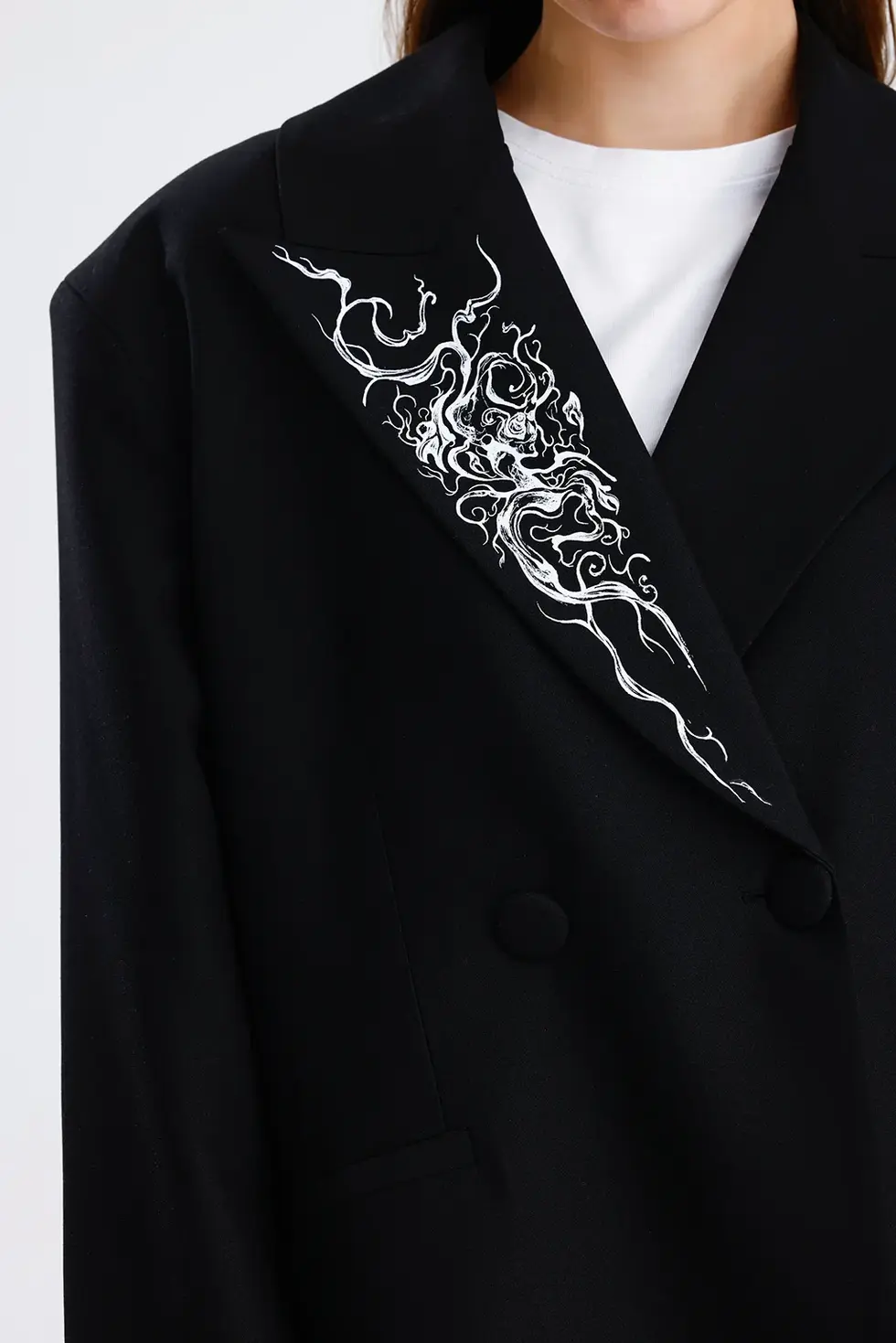 The blazer showcases a custom-designed illustration, hand-drawn exclusively for this piece, then printed on the fabric as a signature artistic statement. Compared to the NYRA FLOW model, the artwork on this version embraces a more minimal approach—making it especially suited to those who favor clean, understated designs.